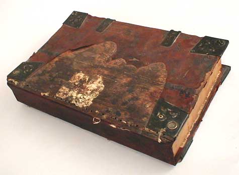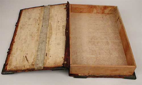 Below: The inside of the board is original. The leather spine is glued to the box tray.