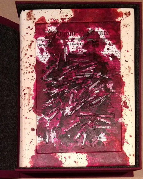 I used some of my own blood, which is spattered on the spine and cover, and matched the color of the fresh blood with acrylic paint for most of the panel. The blood has, of course, turned brownish over time, so the acrylic maintains the illusion of immediacy. The photos above and just below were taken the day the book was completed. The last photo of the book in its box is several months later, and shows the browning of the blood.