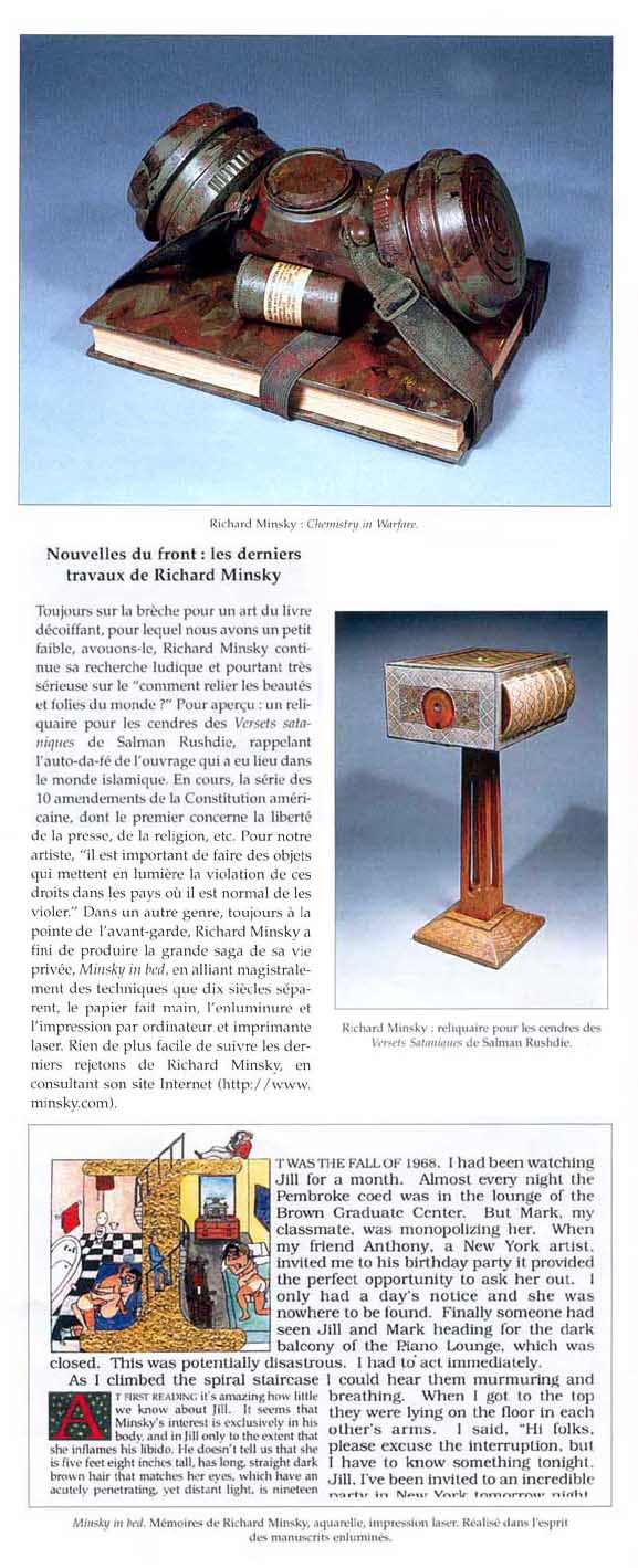 "Nouvelles du front: les derniers travaux de Richard Minsky" par Joëlle Naïm Art & Métiers du Livre, Jan-Feb 1998 Note: The version above combines text and images from two pages of the original article.