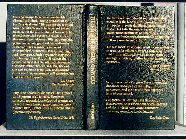 Bound in dark green Nigerian Goatskin, with quotes from the book stamped in 23K gold. Endpapers are Rives BFK, printed on an Epson Stylus 1500 inkjet, and shot at 50 yards with a Norinco MAK-90 semiautomatic rifle. 8 1/2" x 5 1/2".
