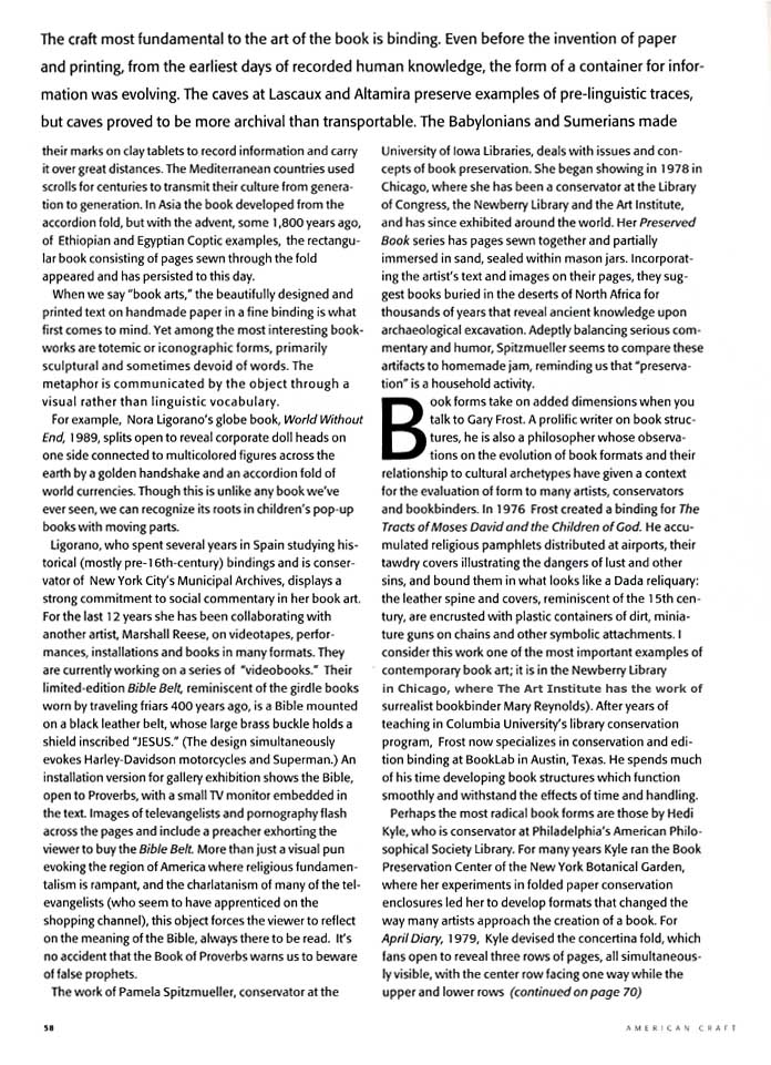 "Innovation from Tradition in the Book Arts" by Richard Minsky. American Craft, October/November, 1993
