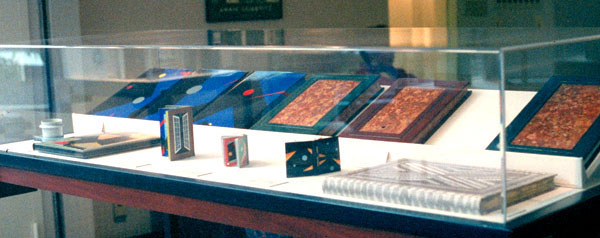 At the Richard Minsky 25-Year Retrospective Exhibition in 1992 sponsored by HarperCollinsPublishers, the exhibit case pictured below featured four lacquered bindings on blank books of handmade paper, three miniature books of studies for geometric binding designs, and a snakeskin binding.  The bindings on the top left (blue and black) constitute a 3-volume set that creates a continuous design when the books are lined up with both covers open, in any order. The three on the top right are individual books in full leather bindings with inlaid recessed lacquer and gold leaf panels.