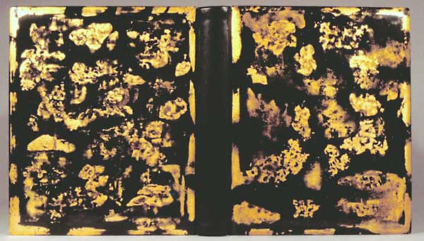 Black calf spine, gold leaf, enamel, varnish, polyurethane and shellac over gessoed boards.