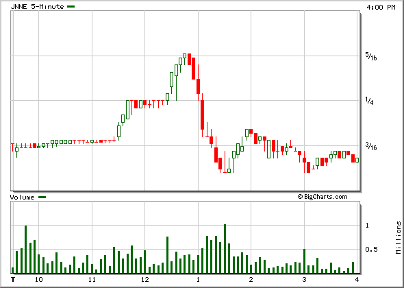 Figure 1: Jones Naughton Entertainment (OTC BB: JNNE) One day 5 minute chart, April 6, 1999 (from BigCharts.com). A classic "Pump & Dump." Over 28 million shares traded, with only 9.8 million shares outstanding. The previous day�s close was at $0.14, and the stock went up and down over 100% in a few hours. The pump preceded a bland news release that was issued at 1:05 pm. The Raging Bull 6 chat room had hundreds of posts that day, and by late morning people were guessing that it was insider trading.