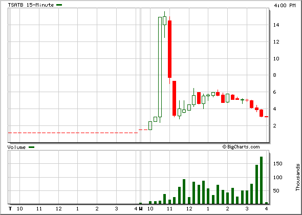 Figure 4: TCI Satellite Entertainment (NASDAQ: TSATB), 2-day 15 minute chart for April 7, 1999. Reuters had their symbol on a news release by mistake, on an article about TCI Music. This shows how many shares can be traded by people who jump on news without doing any research. Over 1.5 million shares traded, on a stock that had almost no activity and traded at about a dollar. It jumped to $15 in a half hour, until some folks figured it out. Reuters released a correction at 2 pm.