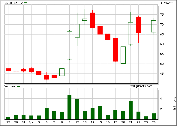 You can see what happened on December 29. With only 2.5 million shares in circulation, about that many shares changed hands. The stock shot up from an open of $2 to a high of almost $14, and back down to $8, all between the issue of the news release at about 12:30 and the close of trading at 4:00 .